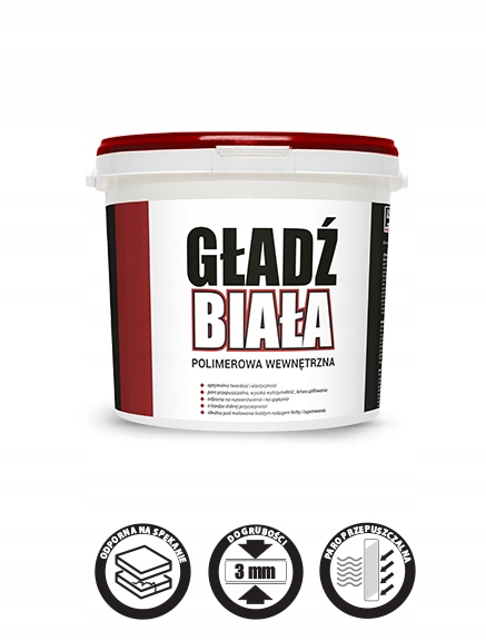 Biała Gładź Polimerowa służy do wykonywania wewnątrz pomieszczeń gładkich powierzchni ścian oraz sufitów pod malowanie oraz tapetowanie. Posiada doskonałą przyczepność do podłoży gipsowych, płyt gipsowo-kartonowych, gazobetonu, tynków cementowych, cementowo-wapiennych, może być również stosowana na podłoża betonowe. Szczególnie nadaje się do ostatecznego wygładzania i wyrównywania powierzchni przed ostatecznym malowaniem. Umożliwia uzyskanie idealnie gładkiej, łatwej do pomalowania białej powierzchni. Nie żółknie pod wpływem światła, nie zmienia swoich właściwości fizycznych, prace wykończeniowe wykonuje się tak samo łatwo zaraz po wysezonowaniu jak i po upływie dłuższego okresu czasu.