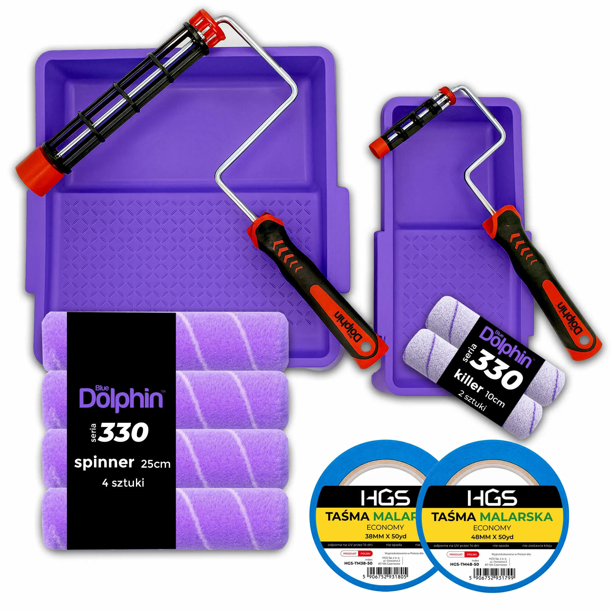 Dolphin 330 – zestaw wałków Spinner, uchwytów roller i kuwet malarskichKompletny, praktyczny pakiet do malowania ścian i sufitów: dolphin 330 łączy wysoką wydajność wałków Dolphin Spinner (poliester 9 mm) z wygodą pracy na uchwytach roller i w solidnych kuwetach malarskich. Zestaw zaprojektowany do farb emulsyjnych i lateksowych na powierzchnie gładkie oraz półgładkie – równomierne krycie i czyste krawędzie dzięki dopasowanemu runu. Skład kompletu: