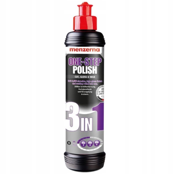 Menzerna 3in1 to broń wszechstronna. Usuwa zmatowienia po papierze wodnym 3000. Jeden strzał - trzy trafienia. Nie zawiera silikonu. Bezpieczna do użycia w zakładach lakierniczych. Oszczędza czas. Zawiera mieszankę naturalnych i syntetycznych wosków wysokiej jakości.
