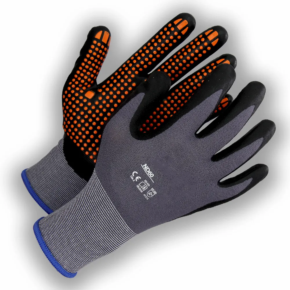 Rękawice robocze PREMIUM z wypustkami antypoślizgowymi – rozmiar 9RĘKAWICE OCHRONNE Rękawice robocze PREMIUM rozmiar 9 to wysokiej jakości rękawice ochronne stworzone z myślą o precyzyjnych pracach manualnych. Wykonane z wytrzymałej dzianiny nylonowej z spandexu, zapewniają świetną elastyczność, wygodę i bardzo dobre czucie w dłoni. Powierzchnia chwytna została pokryta nitrylową mikropianką, co zwiększa odporność na oleje i smary oraz poprawia trwałość w intensywnej eksploatacji. Dodatkowe wypustki (nakropienie) w kolorze zielonym wzmacniają przyczepność – także w trudnych warunkach pracy, gdy liczy się maksymalna kontrola nad narzędziem. Anatomiczne dopasowanie przekłada się na wysoką zręczność, a elastyczny ściągacz stabilizuje rękawice na nadgarstku i zapobiega ich zsuwaniu się podczas pracy. ▶ Nitrylowa mikropianka – odporność na oleje i smary ▶ Wypustki antypoślizgowe – pewny i stabilny chwyt ▶ Elastyczna dzianina ze spandexem – komfort i idealne dopasowanie ▶ Precyzyjne prace manualne – wysoka zręczność ▶ Certyfikaty: CE, EN 388, EN 420 |