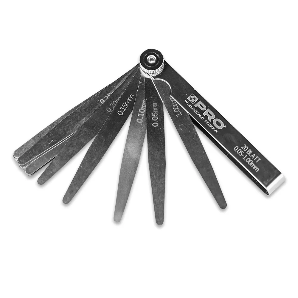 Precyzyjne listki z grawerowanymi oznaczeniamiKażdy listek wyposażony jest w wygrawerowane oznaczenie grubości, co umożliwia szybki i jednoznaczny odczyt wartości pomiarowej bez ryzyka starcia nadruku. Stożkowe zakończenia listków ułatwiają wsuwanie ich w wąskie szczeliny i trudno dostępne miejsca, zwiększając komfort pracy oraz dokładność pomiaru. |