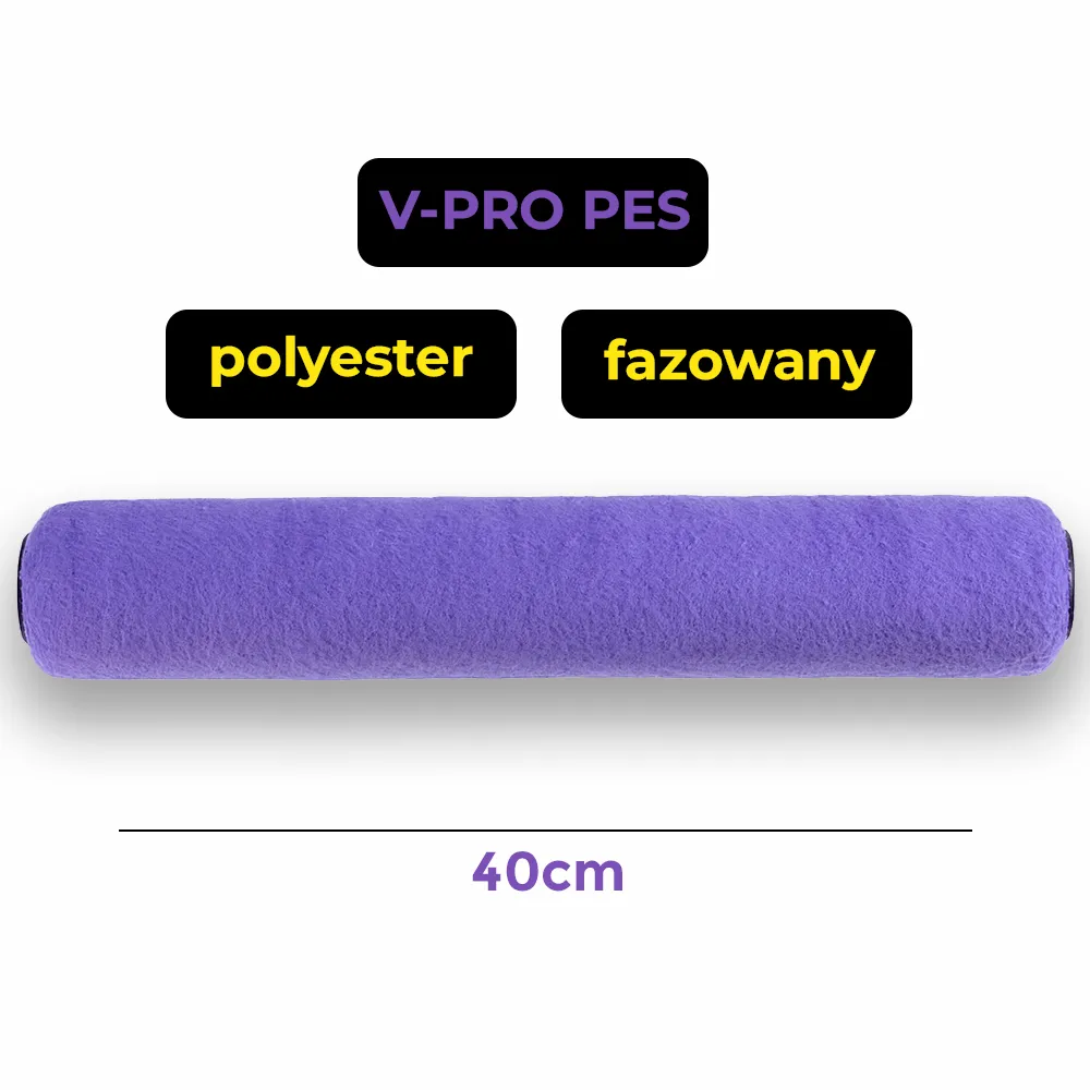 Wałek V-PRO PES 40 cm – wydajność i precyzjaWałek wykonany z poliestru (PES), z runem o długości 12 mm, cechuje się dużą chłonnością, co pozwala pobrać więcej farby z kuwety i szybciej pokryć ścianę. Runo wtopione termofuzją w rdzeń zapewnia trwałość i odporność na częste użycie, a fazowane boki zapobiegają tworzeniu się smug i nadmiaru farby przy krawędziach. To sprawia, że wałek nadaje się do farb emulsyjnych, lateksowych, akrylowych — zarówno na ściany gładkie, jak i lekko chropowate.