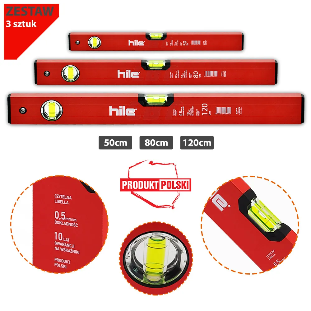 Specyfikacja zestawu:Niezawodne narzędzia dla każdego budowlańca. Produkty wysokiej jakości, wyprodukowane w Polsce. ✅ Producent: PRO Polska ✅ Model: HILE ✅ Rozmiar: 50cm, 80cm, 120cm ✅ Dokładność pomiaru: 0,5 mm/m = 0,029° ✅ Wykonanie: Aluminium malowane proszkowo ✅ Gwara: 10 lat na wskaźniki! ✅ Zestaw poziomic 3 sztuk |
